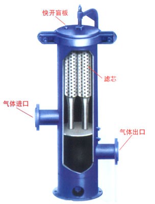 干氣過濾器是一種濾芯式過濾器,里面由多支濾芯組成,過濾的原氣由進氣口通過導流管或者旋風管,將氣體中含有的固體顆粒及油霧碰撞落入容器底部,通過導管進入分離器底部積液包,可通過觀察視鏡窗口外排。然后從濾芯外表面進入濾芯里面進行精度分離,潔凈后的氣體導入絲網除沫器,經過第三部過濾導出。